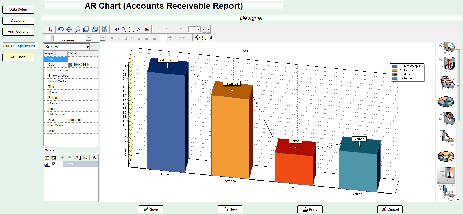 Extensive range of 3D graphs which can be generated from most reports.You can alter the existing set or create your own which can then be saved and filter on at any time giving a comprehensive graphical view of your business.