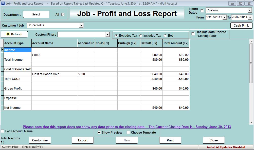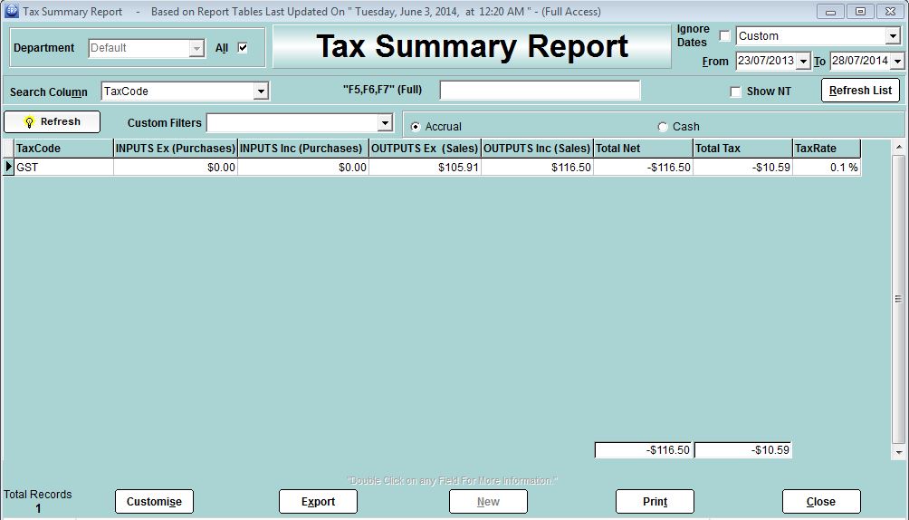 Instant BAS report printout. Preloaded with the correct codes, just requires date selection to load the numbers. If running multiple companies in the one file, you can report on the group of companies or produce an individual BAS report per company. The reports are also fully drillable allowing you to see the transactions that make up the field.