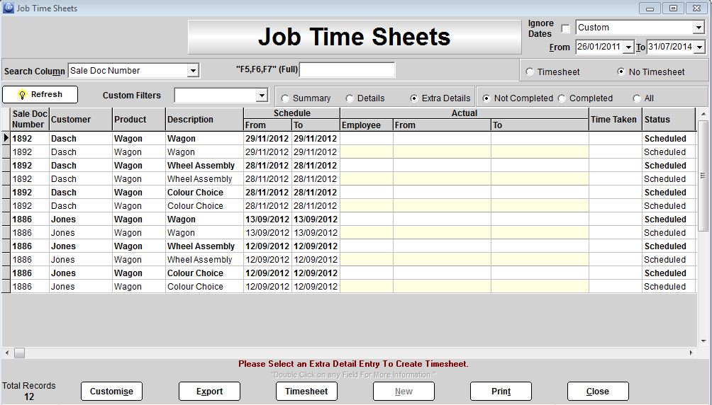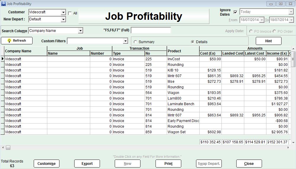 Superbly accurate job costing with total job cost continually updating live as item costs change, labour costs are applied, expenses incurred, and entered, and products purchased. Full time sheet entry facility.