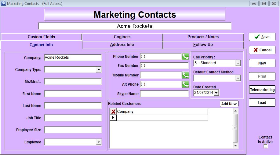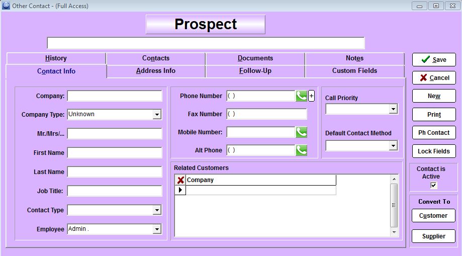 Complete details as required to keep an accurate lead and prospect database, which can be added to, or deleted from, depending on your requirements. This is separated from your customer database but automatically converts to the customer database when required.