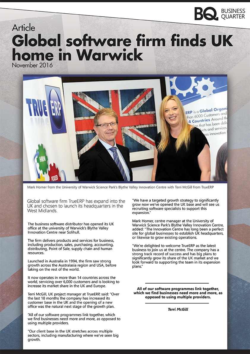 Global software firm TrueERP has expand into the UK and chosen to launch its headquarters in the West Midlands.