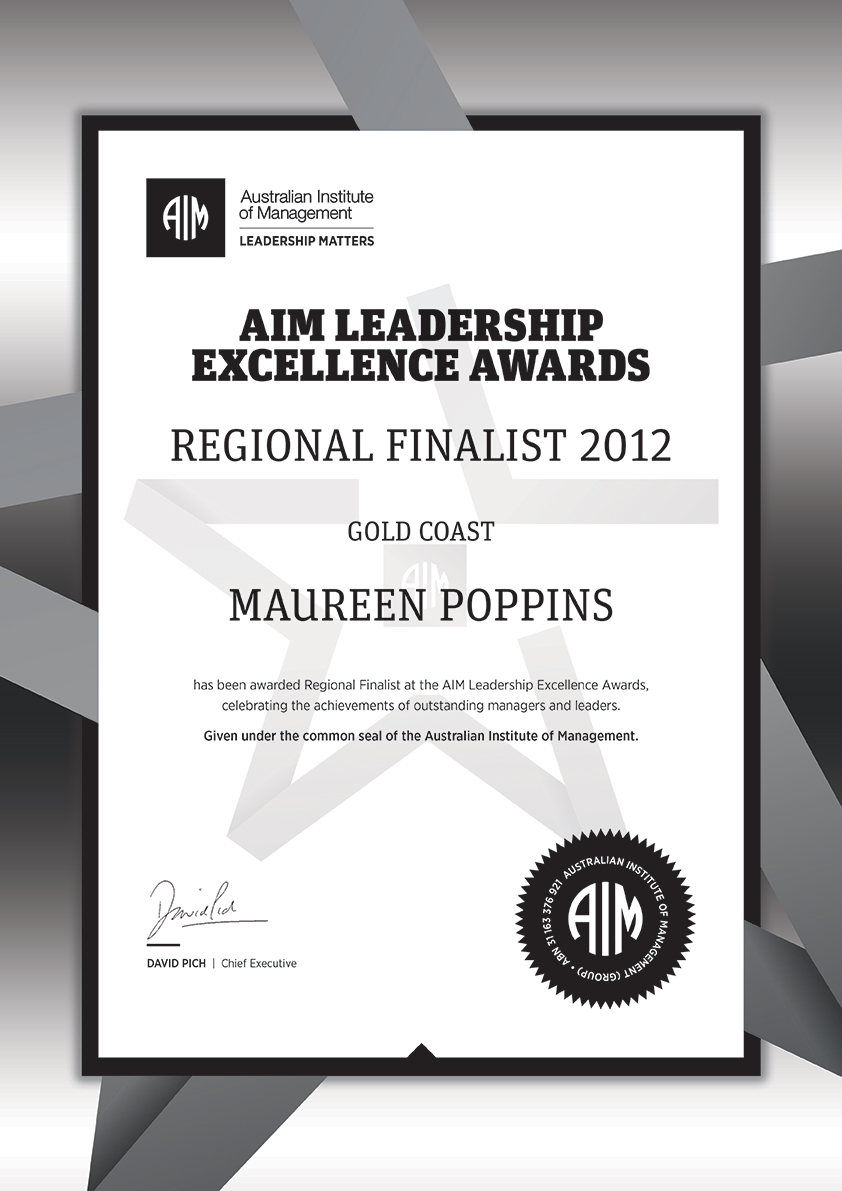 Maureen Poppins has been awarded Regional Finalist at the AIM Leadership Excellence Awards, celebrating the achievements of outstanding managers and leaders.