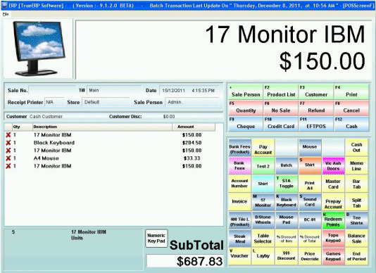 TrueERP POS interface is designed to work with almost all POS hardware, including scanners, receipt printers, cash draws, EFTPOS machines, mag card readers etc.